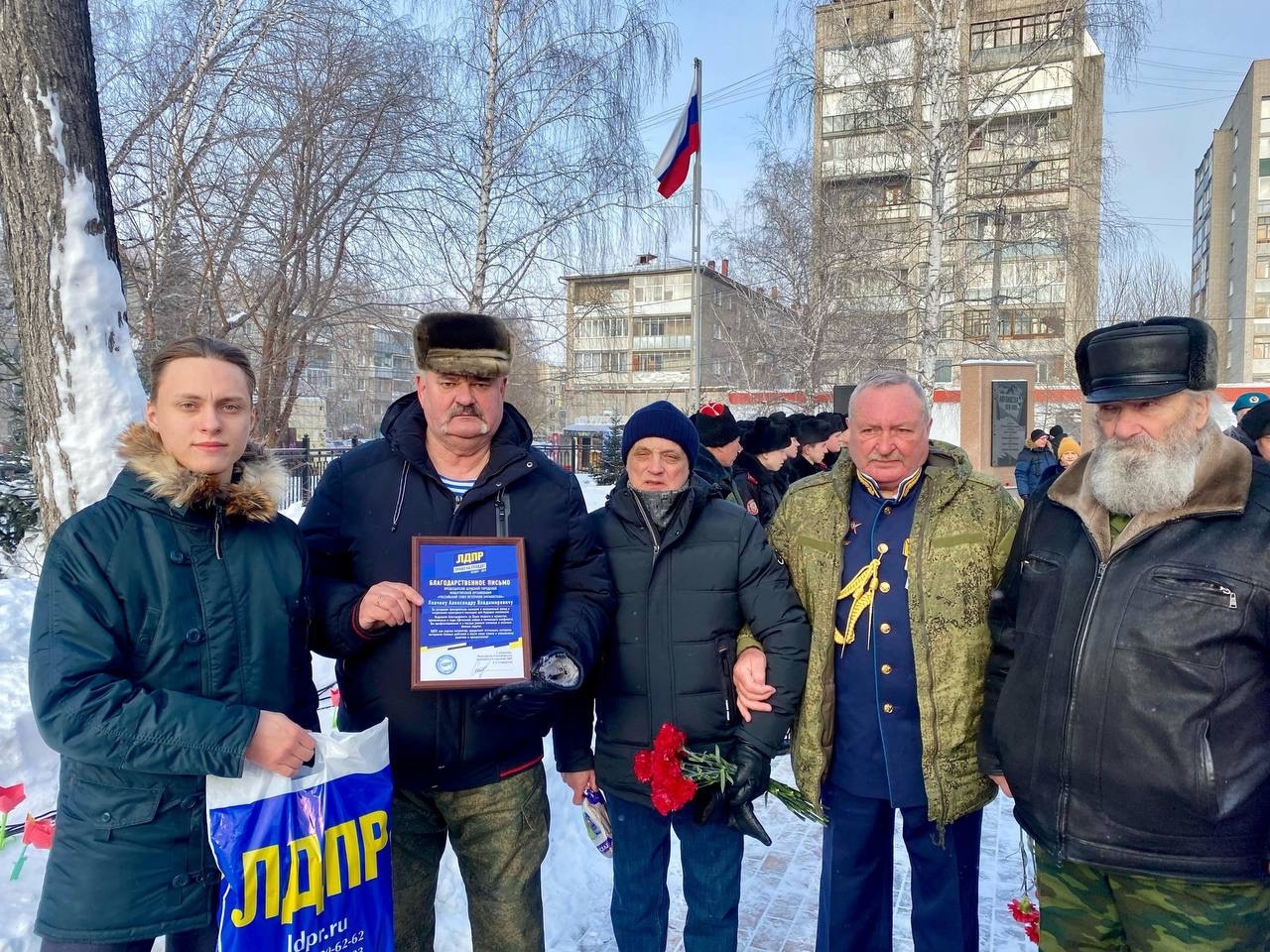 В г. Бердске руководитель городской молодёжной ячейки ЛДПР Матвей Воронцов и активистка Дарья Максимчук приняли участие в церемонии возложения и выразили благодарность Александру Левчику, председателю местной общественной организации «Российский союз ветеранов Афганистана». От имени ЛДПР они вручили ему награду за вклад в защиту интересов Родины в Афганистане и Чечне. После этого они встретились с ветеранами афганской войны и участниками других вооруженных конфликтов.